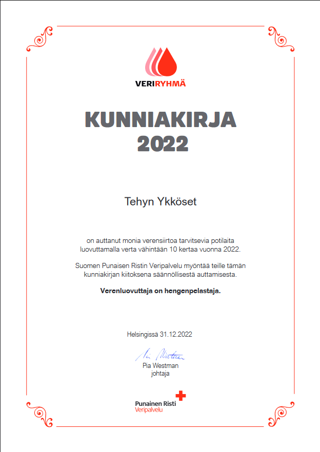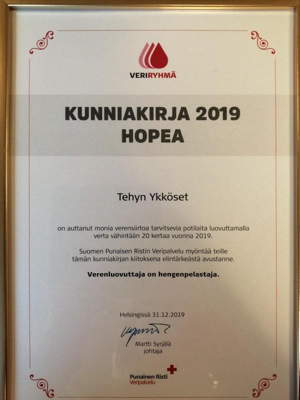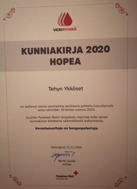 Saimme hopeisen kunniakirjan (yli 20 luovutusta) vuoden 2019 sekä vuoden 2020 luovutuksista! Kiitos kaikille luovuttaneille!